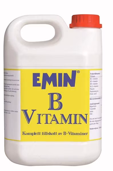 Emin B-Vitamin 1 L, är ett högkoncentrerat kompletteringsfoder som används när halten B-vitamin i det dagliga fodret inte räcker till. Kan vara bra att ge extra vid pälsfällning och -sättning.