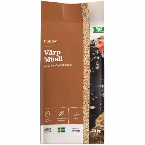 Värp Müsli är ett helfoder som tillverkas i müslistruktur. Fodret tillgodoser hönans näringsbehov vid äggläggning genom en balanserad aminosyraprofil och ett hö