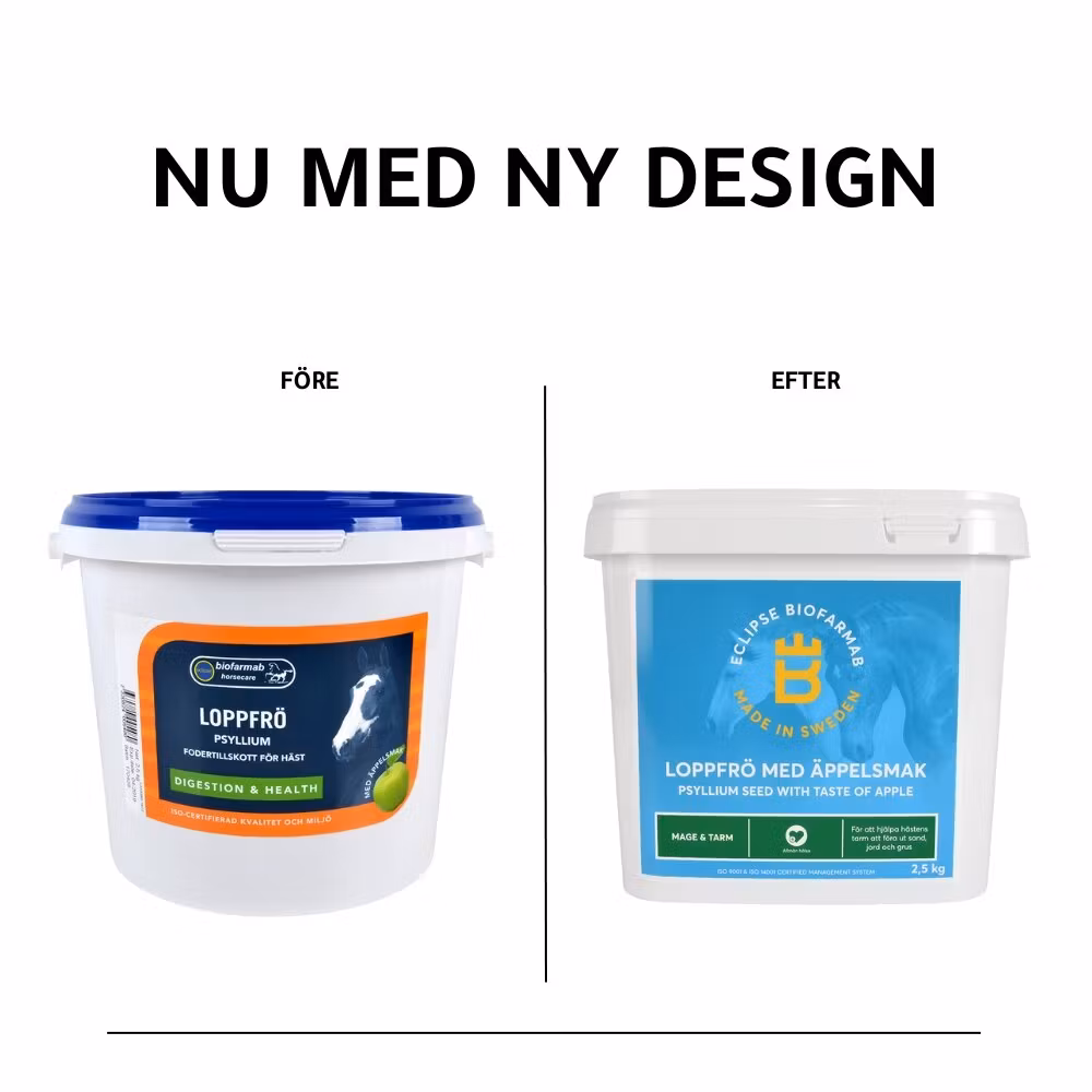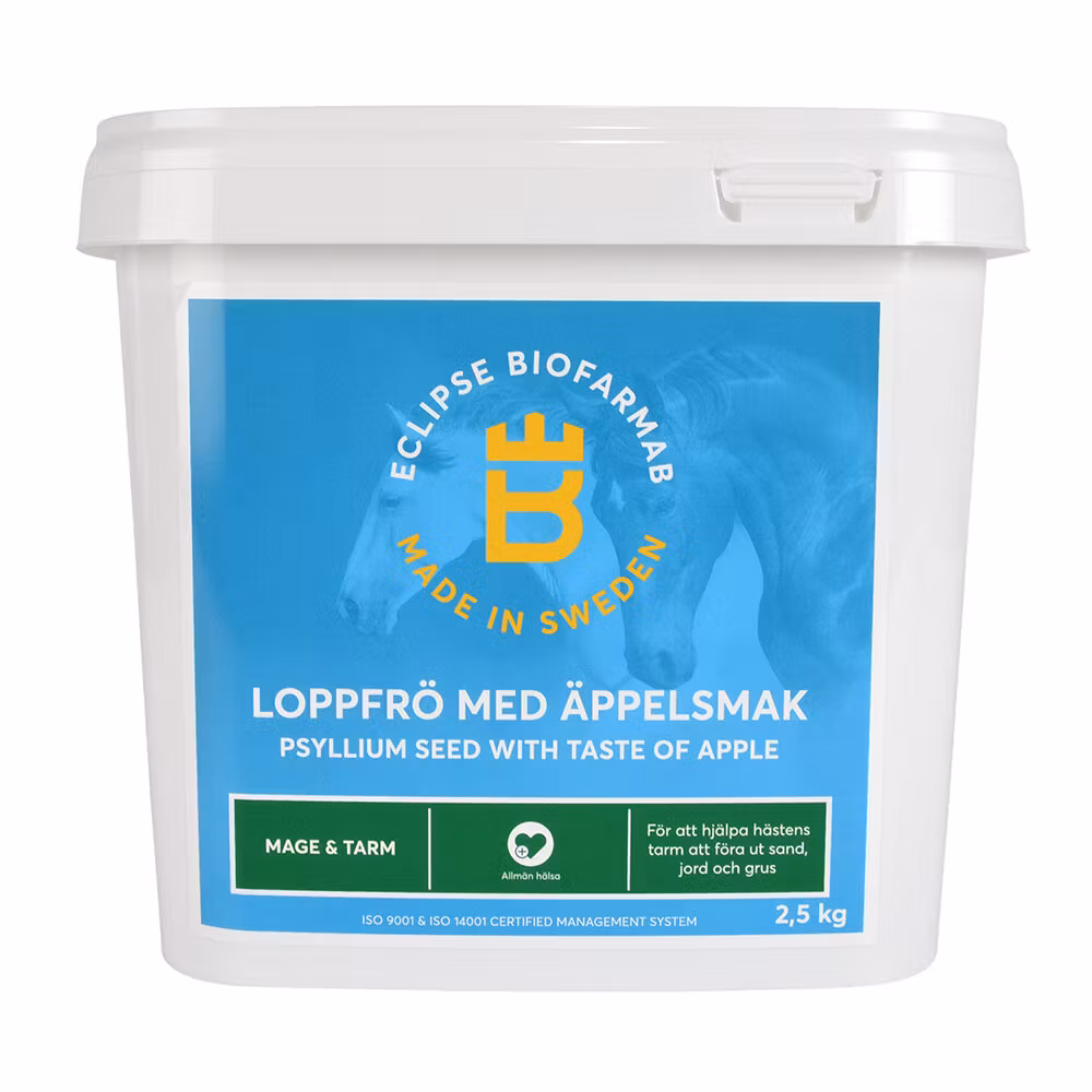 Loppfrö med äppelsmak 2,5 kg från Eclipse Biofarmab är särskilt framtaget för de hästar som är kräsna och som inte uppskattar den vanliga lukten och smaken av loppfrö.