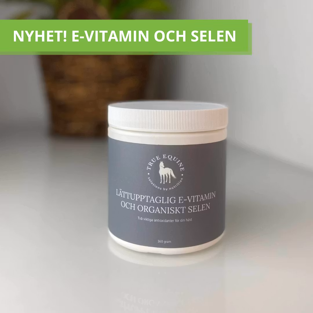 E-vitamin är fettlösligt och lagras i musklerna, fettvävnaderna och levern. E-vitamin tillverkas inte av hästens kropp utan måste tillsättas via fodret. E-vitamin är en antioxidant som bidrar till att motverka oxidation i kroppens celler som orsakas av de fria radikalerna som leder till skador på cellerna om de ej hindras.