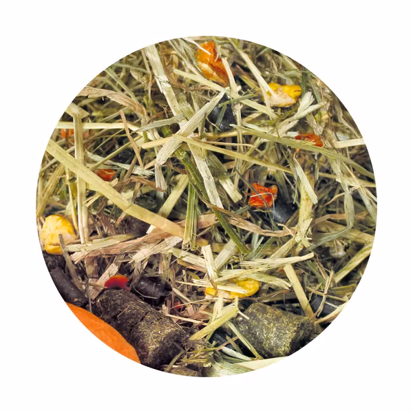 Torkat gräs, hö, gräspellets, glycerin, linfrö, kalciumkarbonat, monokalciumfosfat, ärtflingor, lupinflingor, magnesiumoxid, torkad morot, salt.